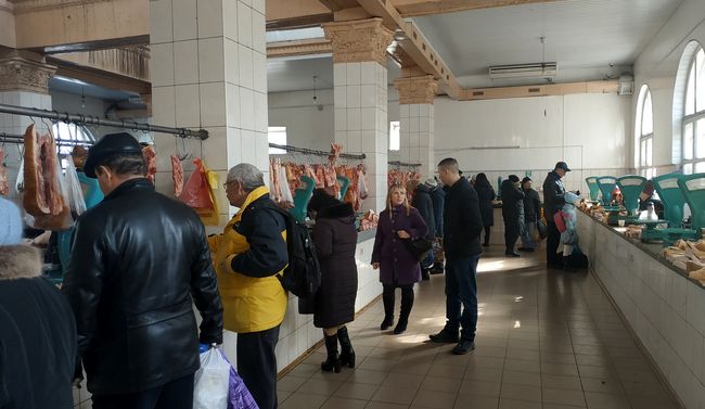 Переходим постепенно к мясному павильону. Как всегда, перед входом жительницы из близлежащих сел продают свежую домашнюю птицу: уточек, курочек, куриные бульонные наборы. За другим столом хозяйка из Киенки кроме кур продает индейку и нутрию. Рассказывает, что мясо нутрии похоже по вкусу на что-то среднее между говядиной и свининой.