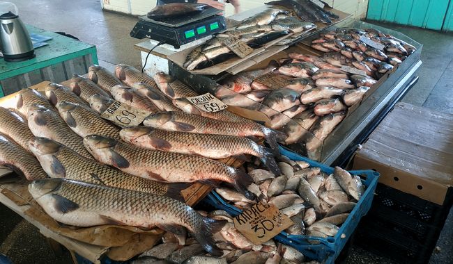 В рыбном павильоне горожане могут выбрать по своему вкусу свежую и свежемороженую, охлажденную, соленую и копченую рыбу. Также, в продаже есть весовая лососевая икра, мидии и креветки.