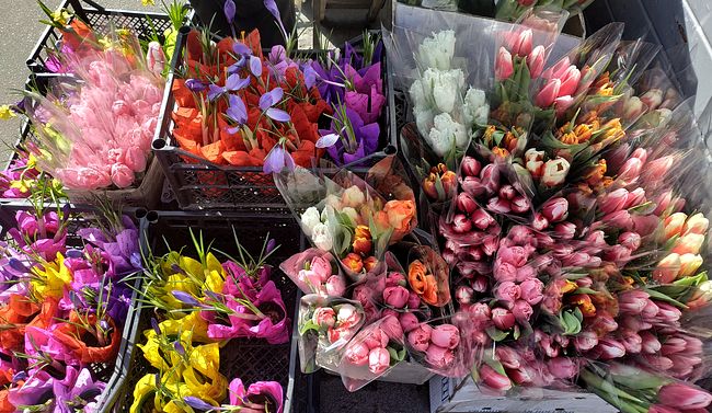 Конечно, по всему рынку, в изобилии живые тюльпаны, гиацинты, нарциссы.
