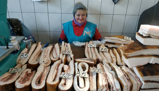 Как обычно, на своем рабочем месте Антонина Г. У нее в продаже всегда очень вкусное полтавское и ичнянское соленое сало, которое готовится с помощью специальной заливки горячим рассолом. Когда рассол остынет, сало ставят в холодильник на 3-4 дня. После чего самая вкусная украинская закуска готова!