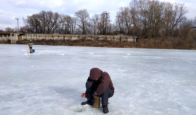 Рыбаки пришли ранним утром, когда температура воздуха была -5 С, одевшись в теплую водонепроницаемую одежду и утепленные резиновые сапоги. Обязательными атрибутами зимней рыбалки является специальный ящик, где хранятся снасти, стульчик, прикормка, еда и необходимый инвентарь, в частности, ледоруб, чтобы сделать лунку (хотя их много в разных местах) и черпак, чтобы убирать лед, затянувший лунку. Некоторые используют пешню - инструмент с острым наконечником, предназначенный для раскалывания льда. Если рыбак собрался надолго, то берет с собой, конечно, термос с горячим чаем, а кто-то, что-нибудь и покрепче.
