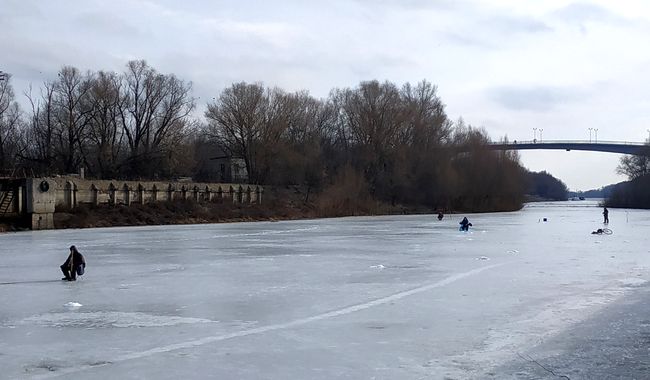 Морозной зима в этом году была в январе. Температура воздуха доходила до -15 С, выпал снег, а Десна, как водится, покрылась толстым слоем льда. Но в феврале столбик термометра потихоньку стал подниматься вверх, и к 8 марта снег в городе полностью растаял. Но Десна рядом с набережной перед пешеходным мостом пока без проталин, а если заглянуть в лунку – лед имеет толщину около 30 см. А вот за мостом под действием течения ледоход уже начинается.