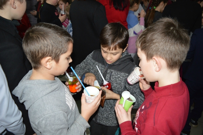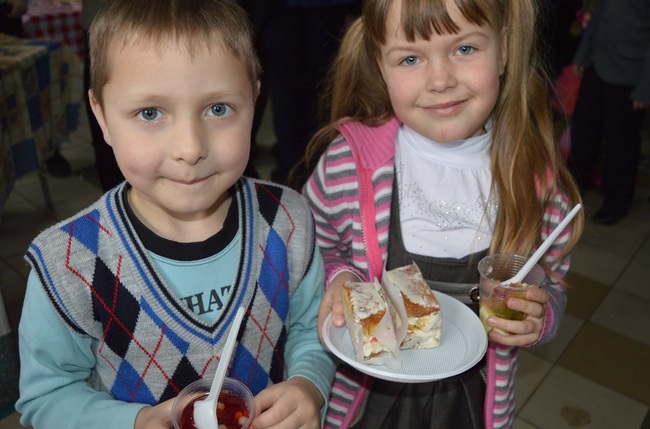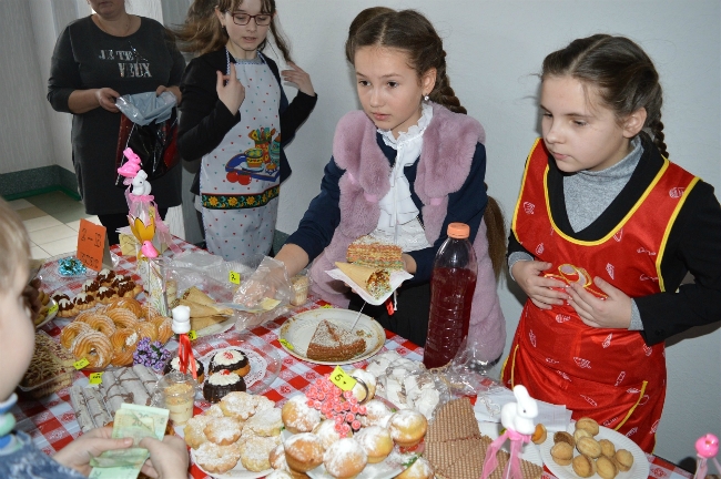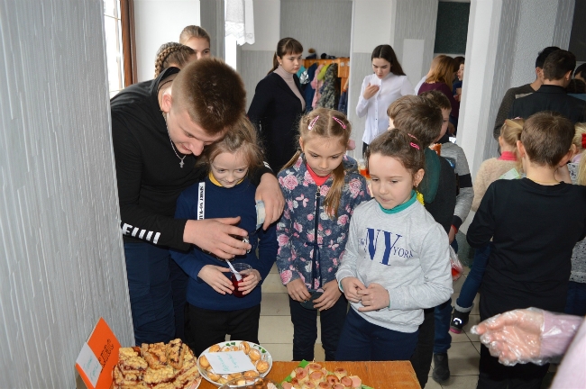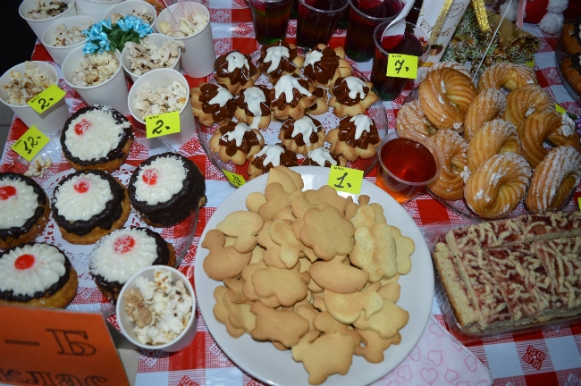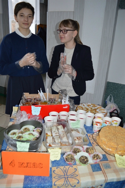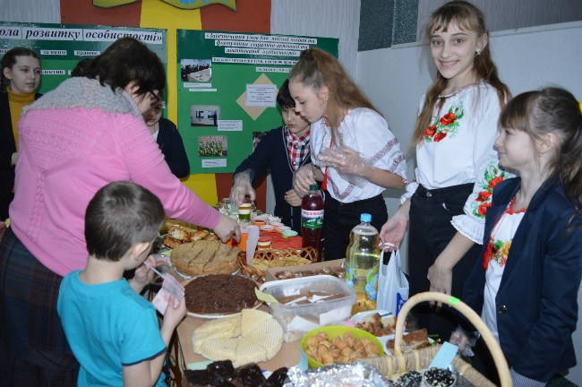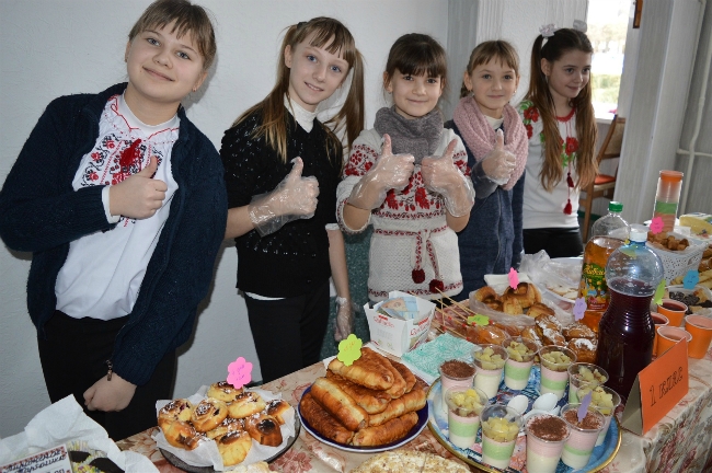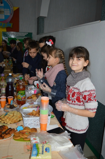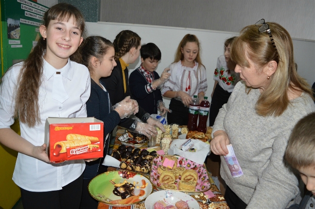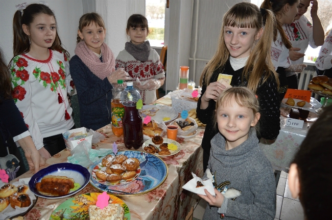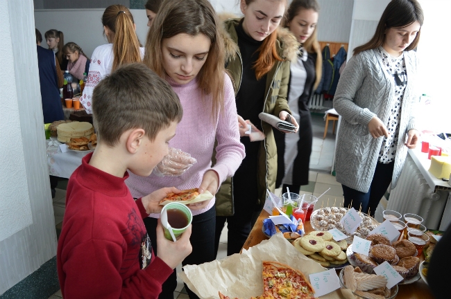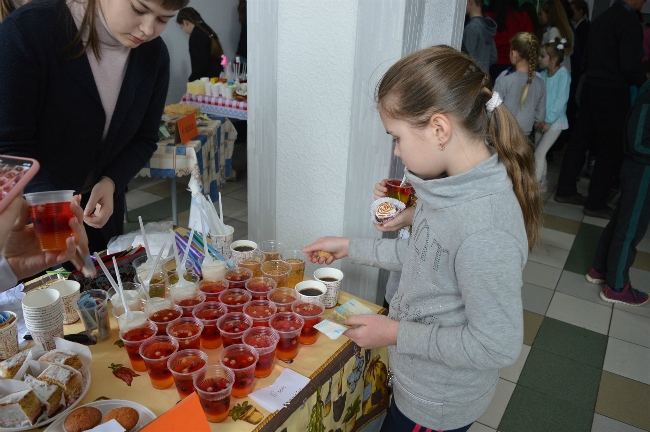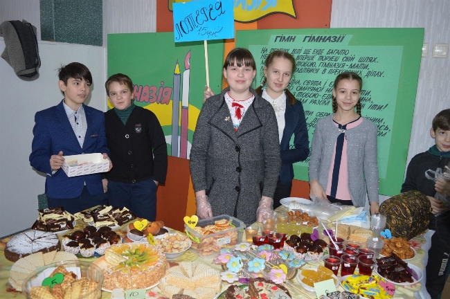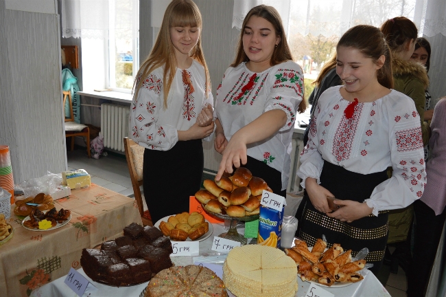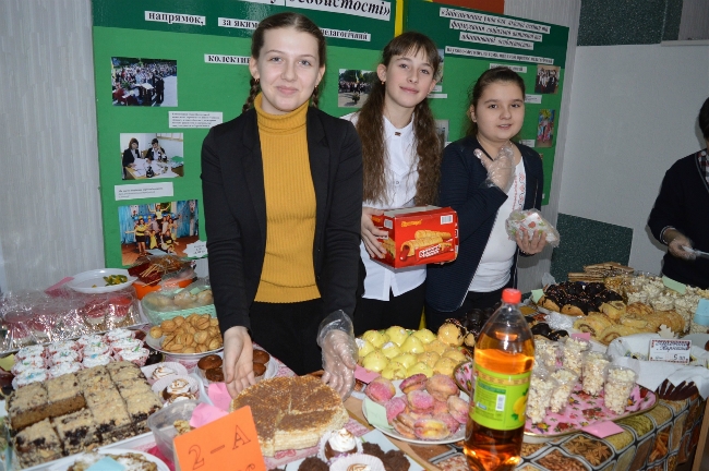 На імпровізованих ятках кожен клас продавав свої частування. Піца, пиріжки, булочки, печиво, кекси, горішки, трубочки, торти, домашні цукерки, льодяники, фруктове желе, компоти і, звичайно ж, млинці з різноманітними начинками. І все це — за символічною ціною. Кожен клас активно запрошував купувати саме у них, бо — «натуральне, без ГМО і з любов’ю!»