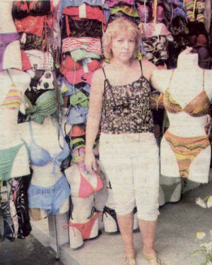 — Девочки сейчас берут лифчики-шторки и трусики на завязках по бокам, чтоб регулировалось все, — показывает частный предприниматель Ирина Горбачевская. — Из расцветок — газетка, блесточки всякие.