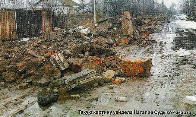 — На улице А.Галушки живут мои родители, а мы с детьми — на соседней. Сколько себя помню, на той улице всегда была грязь, асфальта там никогда не видели. Грунтовую дорогу постоянно чем-то подсыпали, но такого, как наделали сейчас, не припомню. В понедельник, 4 марта, я свернула с асфальта на родительскую улицу и остолбенела: она была засыпана горами кирпича и обломками бетонных плит, все это вперемешку с землей, битым стеклом и еще невесть чем, — рассказывает 35-летняя Наталия Судыко. Именно она сделала столь красноречивое фото.