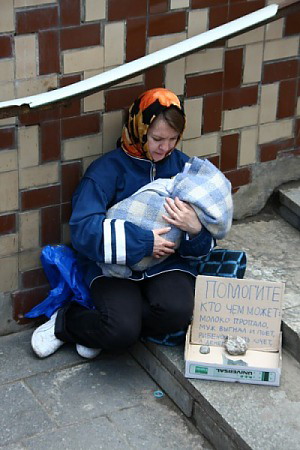 Я несколько раз меняла место своей дислокации: посидела возле Главпочтамта, в подземных переходах по просп. Мира, под церковью возле Центрального рынка - и могу теперь охарактеризовать типичное поведение горожан по отношению к тем, кто просит милостыню с ребенком. Реакция была примерно такова: одни горожане просто равнодушно проходили мимо, вторые в недоумении искоса поглядывали на меня и, шарахаясь, как от прокаженной, старались быстрее обогнуть «препятствие». Нашлись и сердобольные граждане. Интересно было наблюдать: некоторые из них, пройдя пару шагов вперед и тут же «одумавшись», делали рывок назад и, как бы оправдываясь, молча вносили свою лепту — дабы улучшить жизнь моему «чаду».