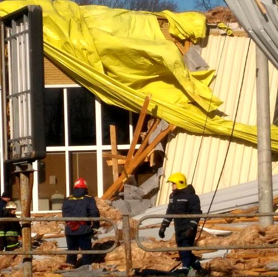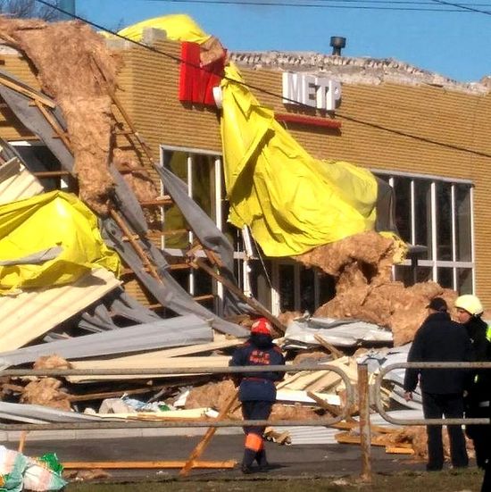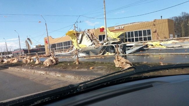 Сегодня, 22 марта в Чернигове стоит переменчивая погода – солнце, появившееся утром сменилось на моросящий мелкий дождь к 11 утра, а через 3 часа начался дождь и поднялся сильный ветер. В результате сильного порыва ветра с нового довольно большого магазина «Квадратный метр», открывшегося в конце прошлого года, снесло крышу.