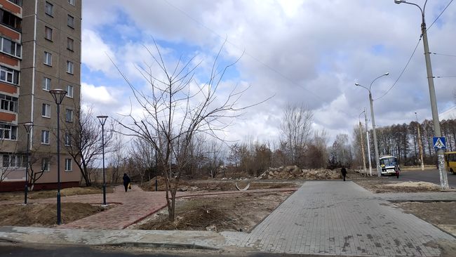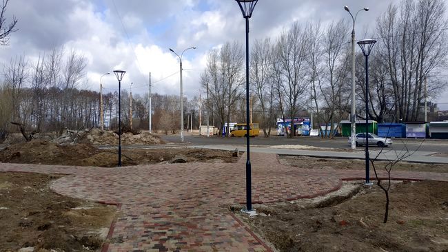 Рядом с дорожками установлены уличные фонари. Вскоре работы возобновятся. Это участок недалеко от дома №56.