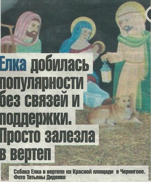 Этой зимои под главной елкой в Чернигов вместо Деда Мороза и Снегурочки ставили вертеп. Его макет, как и дидухи, и соломенный лабиринт, для новогоднего городка ращработала общественная организация «Че Студия». А оживила конструкцию брошенная собачка, которой сильно не хватало дома и будки.