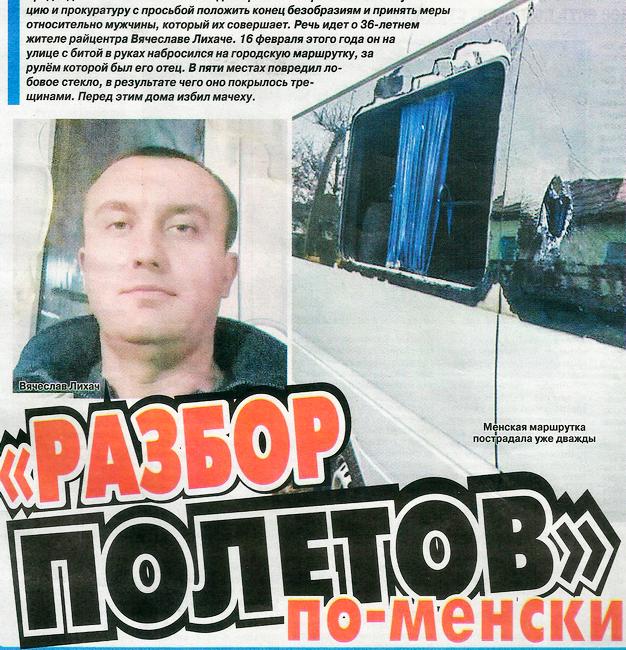 Председатель Менской ОТО Геннадий Примаков обратился в местную полицию и прокуратуру с просьбой положить конец безобразиям и принять меры относительно мужчины, который их совершает. Речь идет о 36-летнем жителе райцентра Вячеславе Лихаче. 16 февраля этого года он на улице с битой в руках набросился на городскую маршрутку, за рулём которой был его отец. В пяти местах повредил лобовое стекло, в результате чего оно покрылось трещинами. Перед этим дома избил мачеху.