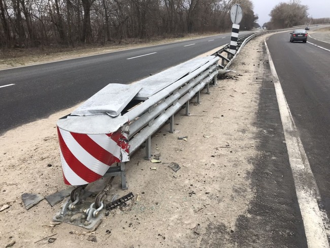 Демпферна система, встановлена на автомобільній дорозі М-01 Київ-Чернігів-Нові Яриловичі, пройшла перше випробування. Ось так виглядають наслідки зіткнення автівки з цією конструкцією. Внаслідок удару система деформувалась, при цьому зберігши життя людей, що їхали в автомобілі.