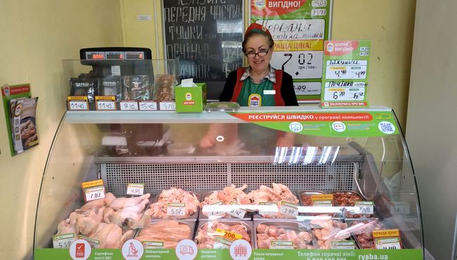В павильоне «Наша Ряба», кроме свиного, конечно, в продаже всегда свежее куриное и индюшиное мясо тоже из Ровно. Лидия Юрьевна Осипенко работает в магазине уже год. Живет неподалеку, признается, что работа ей очень нравится. Мясо от «Нашей Рябы» заказывает немного, чтобы не оставалось на следующий день. Поэтому, оно в продаже всегда свежее. Завоз - 2 раза в день.