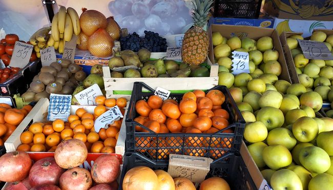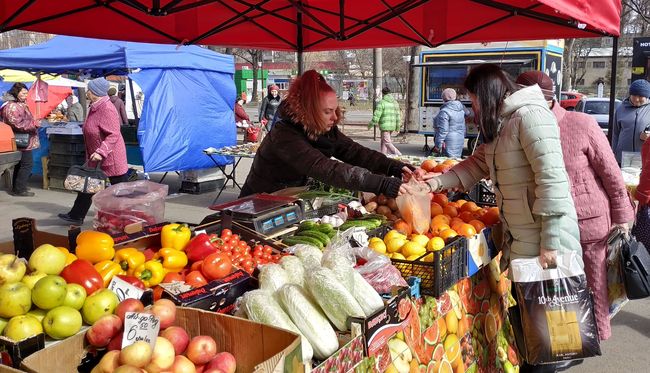 На фруктово-овощных прилавках в эту пору года – в большом ассортименте наши украинские яблоки и цитрусовые. В продаже есть сухофрукты и орехи.