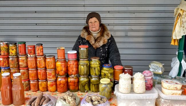 На прилавках в торговых рядах - домашние заготовки в виде солений и консервации, варенье, орехи и овощи, домашние молочные продукты и куриные яйца.
