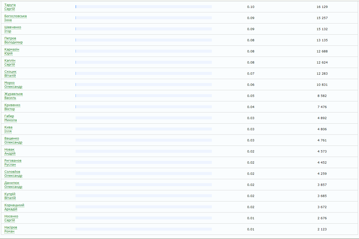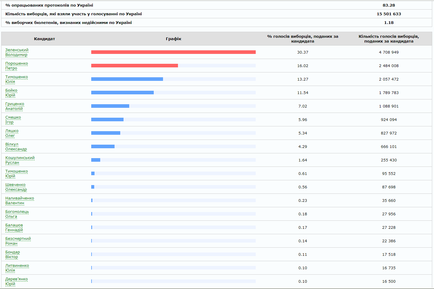 Согласно этим данным, в избирательной гонке лидирует Владимир Зеленский с результатом 30,37% (4 708 949 голосов).