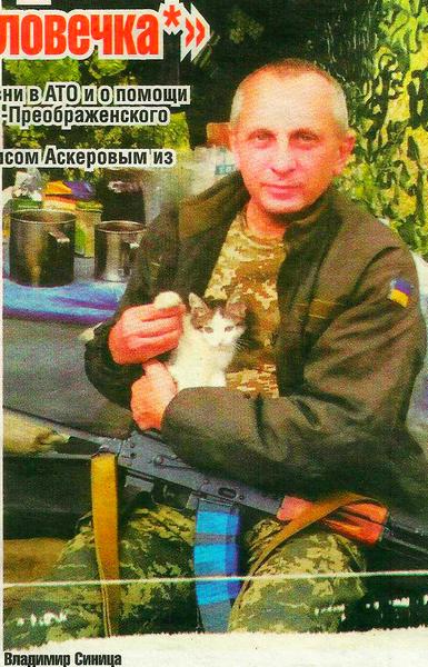 52-летний черниговец Владимир Синица расписывает храмы. В зоне АТО прослужил 13 месяцев. Вернулся первого октября прошлого года. До этого был на Майдане. Его иконы в Троицком и Спасо-Преображенском соборах Чернигова (внутренняя сторона иконостаса в Троице, иконы «Явление Святой Троицы преподобному Александру Свирскому»). Есть работы в Седневе, Надиновке, Боромыках. В частных коллекциях за границей. И даже в церкви на знаменитом русском кладбище под Парижем — Сент-Женевьев-де-Буа, где покоятся все самые известные эмигранты из Советской России.