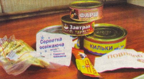 Рибка, м'ясо у бляшанках, повидло й бульйон у пакетах