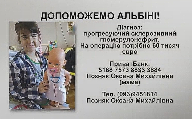 Наприкінці минулого року Альбінка потрапила до лікарні у важкому стані. Після обстежень проведених у Чернігівській обласній дитячій лікарні та інституті нефрології Національної академії медичних наук України дівчинці встановили діагноз: прогресуючий склерозивний гломерулонефрит, хронічно хвороба нирок V ступеню, хронічна ниркова недостатність IV.