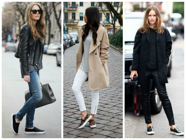 Слипоны — обувь на стыке направлений, поэтому они органично впишутся в спортивный шик, кэжуал и городской элегантный стиль. Носить кеды без шнурков можно с узкими брюками, юбками разной длины, джинсами мом, кардиганами, жакетами, бомберами, пальто оверсайз. Не исключены комбинации слипонов из лакированной кожи с брючным однотонным комплектом. Особенно женственно выглядят сочетания с шелковыми принтованными легкими платьями.