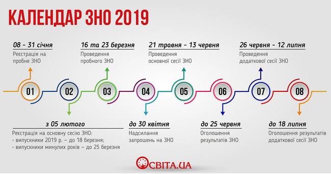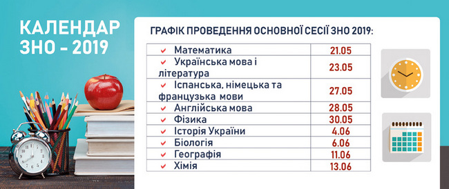 Основная сессия внешнего независимого оценивания начнется 21 мая тестированием по математике и завершится 13 июня тестированием по химии. Тестирование по украинскому языку и литературе состоится 23 мая, по испанскому, немецкому, французскому языкам — 27 мая, по английскому языку — 28 мая, по физике — 30 мая, по истории Украины — 4 июня, по биологии — 6 июня, по географии — 11 июня.