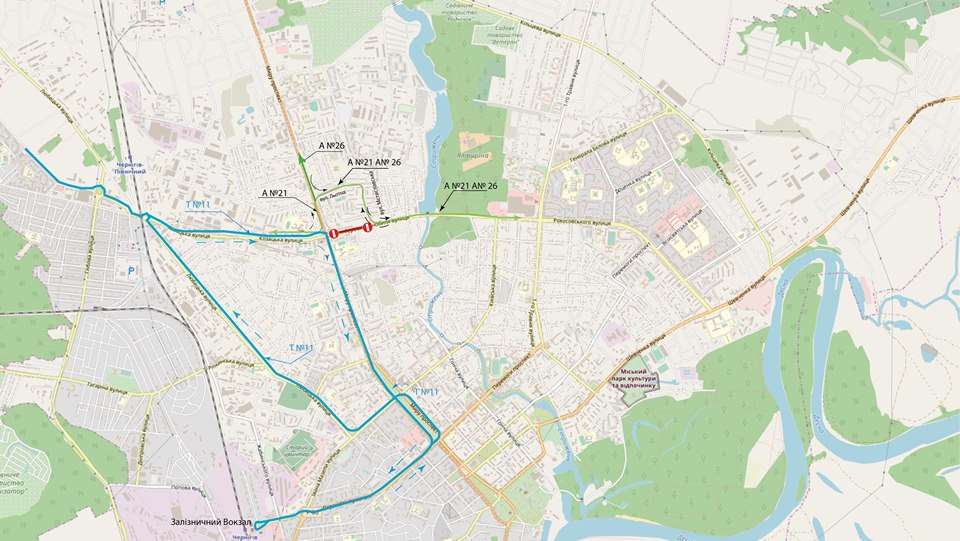 Автобусний маршрут № 21 буде здійснювати об'їзд перекритої ділянки дороги по вулицях: Козацька — проспект Миру — Льотна — Мстиславська — Героїв Чорнобиля і далі за маршрутом.