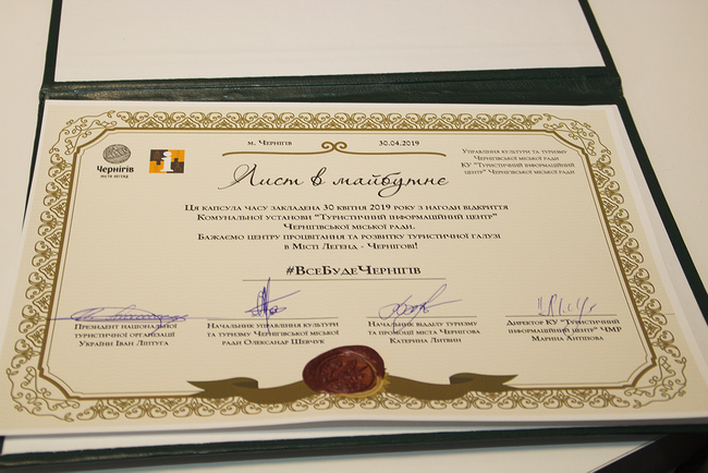 Присутствующие заложили капсулу времени с письмом в будущее, в котором пожелали процветания и развития туристической отрасли в Городе Легенд – Чернигове!