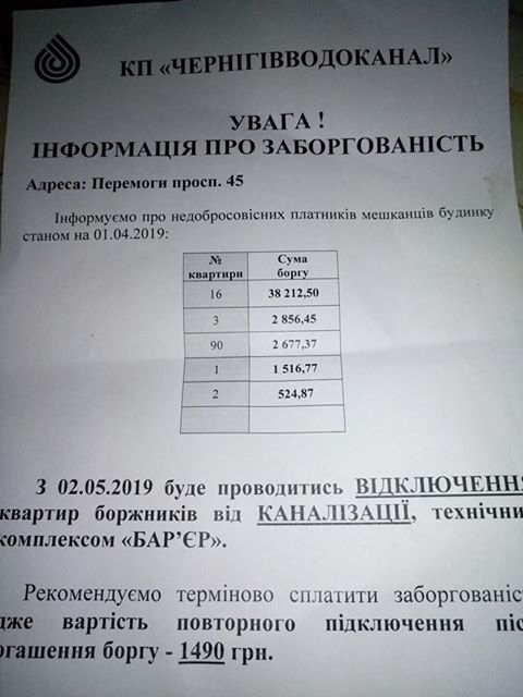 На фото, которое выслала черниговчанка расписаны суммы долгов в порядке убывания, самый большой из них составляет 38 212 грн., самый маленький – 524 гривны. Также сообщается, что канализацию перекроют техническим комплексом «Барьер» 2 мая, то есть сегодня, а за повторное подключение, даже если долг будет погашен придется заплатить 1490 грн.