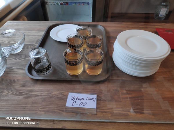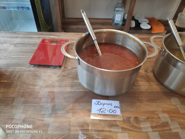 Расчет с клиентами идет за наличные, блюда предварительно подогревают в микроволновке и взвешивают на маленьких настольных весах. Есть кофе машина (Эспрессо и Американо по 10 грн), чай, узвар и напитки в бутылках. В коридоре перед входом есть рукомойник с жидким мылом.
