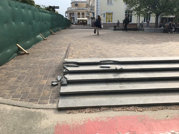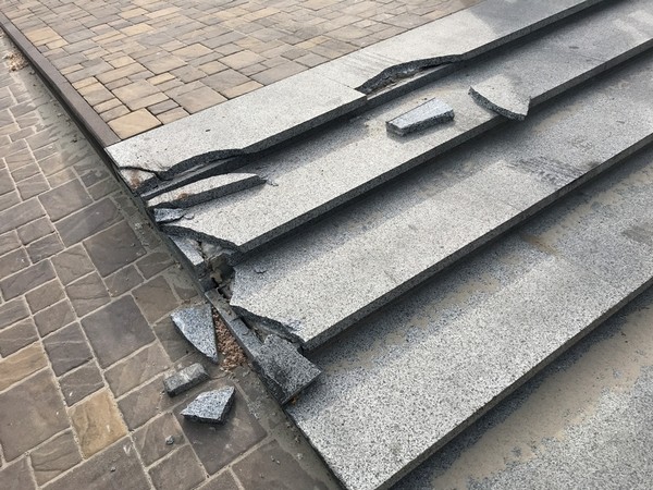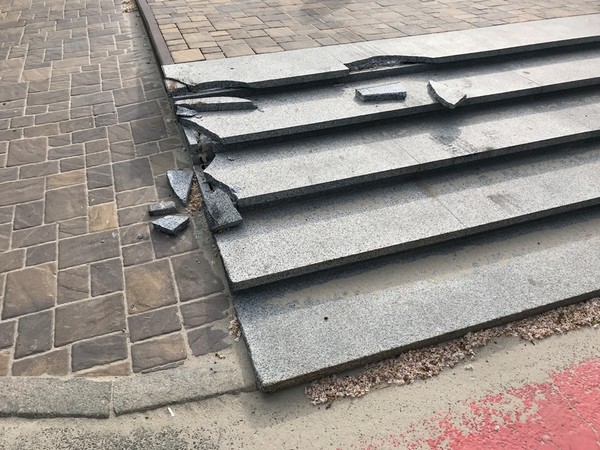 Тим не менш, деякі чернігівці, автовласники зокрема, й досі не у курсі того, що руху на площі на даний час нема. Тому вони впевнено їдуть на своїх автівках по проспекту Миру у напрямку площі, а коли розуміють, що рух перекрито, повертаються назад. Хтось просто розвертається біля будинку з ресторанами, а хтось воліє переїхати через "стометрівку" та виїхати на дорогу біля апеляційного суду. При тому, робить це досить багато водіїв, як на легковиках, так і на більш важких автомобілях. Як результат - розбиті вщент гранітні сходи, які не витримують ваги чернігівських автівок. Враховуючи теперішній вигляд сходів, їм, як і Красній площі, також знадобиться реконструкція, - повідомляє наш читач Дмитро, та додає світлини, на яких видно, як зруйнувалися сходи через недисциплінованих водіїв.