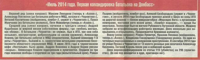 Ходили также слухи, что бойцы батальона «Чернигов» отжимают авто и, вроде бы, даже квартиры у жителей в зоне АТО, превышают служебные полномочия, продают право на вы- щ-выезд из зоны АТО, привозят оружие, патроны.