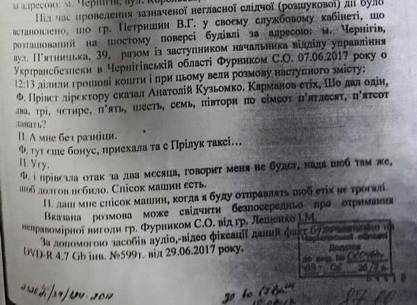 Згідно обвинувального акту, який складала прокурор прокуратури Чернігівського області Тетяна Іванівна Наливайко, Інна Лещенко заходила до Управління спитати за процедуру оформлення ліцензії у середині квітня 2017-го. В ході зустрічі з Сергієм Фурніком, їй було повідомлено, що можна займатися таксуванням без отримання ліцензії, а за це вона має сплачувати щомісяця 3000 гривень. А 25.04.2017 було розпочате кримінальне провадження за номером №12017270000000337.