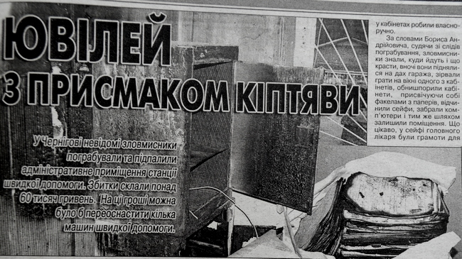 За словами Бориса Андрійовича, судячи зі слідів пограбування, зловмисники знали, куди йдуть і що красти, вночі вони піднялися на дах гаража, зірвали грати на вікні одного з кабінетів, обнишпорили кабінети, присвічуючи собі факелами з паперів, відчинили сейфи, забрали комп’ютери і тим же шляхом залишили поміщення. Що цікаво, у сейфі головного лікаря були грамоти для співробітників “швидкої допомоги", нагороджених з нагоди ювілею, до деяких із них були прикріплені конверти з невеличкими сумами преміальних, але у темряві злодюги не помітили цих грошей. Після того як крадії втекли, загорілися розкидані папери. На щастя, пожежа почалася у зачиненій кімнаті і вогонь не сильно розгорівся. Однак шкоди нічний візит непроханих гостей завдав чималої.