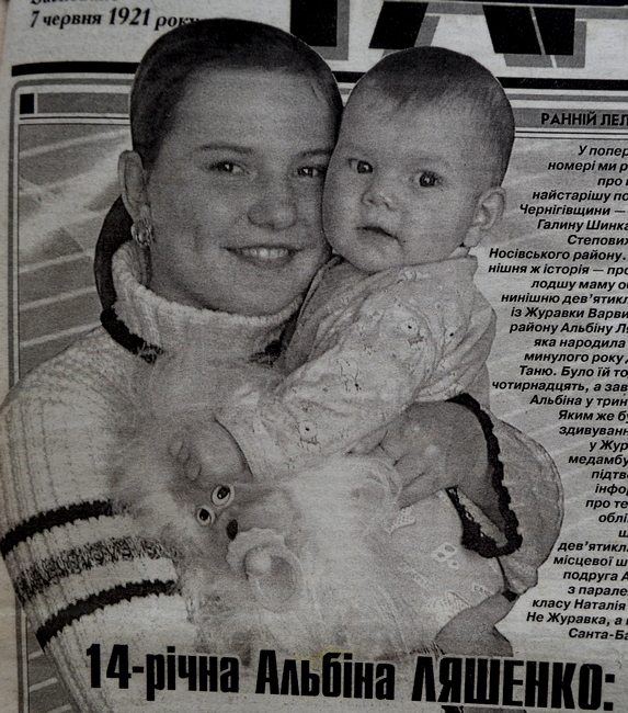 У попередньому номері ми розповіли про ймовірну найстарішу породіллю Чернігівщини — 66-річну Галину Шинкаренко із Степових Хуторів Носівського району. Сьогоднішня ж історія — про наймолодшу маму області нинішню дев’ятикласницю із Журавки Варвинського району Альбіну Ляшенко, яка народила у травні минулого року донечку Таню. Було їй тоді лише чотирнадцять, а завагітніла Альбіна у тринадцять. Яким же було моє здивування, коли у Журавській медамбулаторії підтвердили інформацію про те, що на облік стала ще одна дев ’ятикласниця місцевої школи — подруга Альбіни з паралельного класу Наталія Таран. Не Журавка, а просто Санта-Барбара якась.