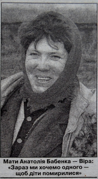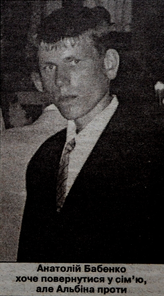 — Якось на базарі мене зустріла Тамара, — говорить Микола Бабенко. — „Добрий день, свате!" — „Який я тобі сват?" — „Альбіна вагітна від вашого Толі. Що будемо робити?” — „Вирішуйте самі, як допустили до цього!” Ми прийняли Альбіну як рідну доньку, але вона повела себе недостойно.