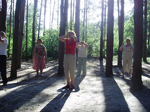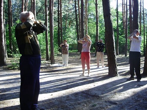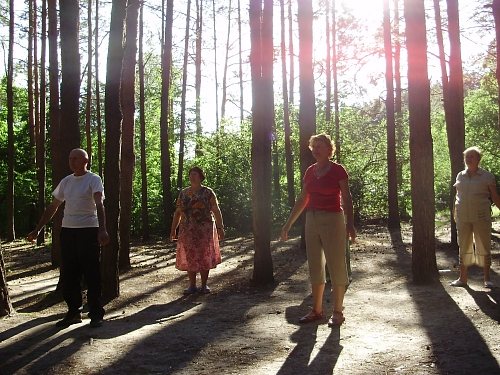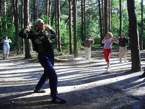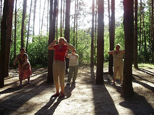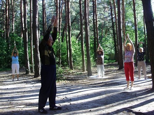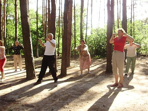 Прогуливалась недавно в Яловщине и дошла до района ботанического сада. Там мое внимание привлекла группа бодрых пенсионеров, которые на красивой лесной полянке среди сосен занимались упражнениями и много и громко смеялись. Мне стало интересно – подошла поближе, поинтересовалась, кто это такие, и для чего здесь собрались. Оказалось, что все они - члены местного клуба здоровья и таким образом – на природе лечат астму, бронхиты, остеохондроз и другие недуги. Из разговора с их тренером Григорием Александровичем Гамлявым я узнала, что победить болезни можно отнюдь не дорогими лекарствами из аптек, а физкультурой, свежим воздухом и смехом.
