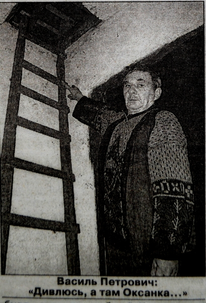 А коли вранці прокинувся, дивлюся: стоїть тазик із водою та мило. Думаю, що це Оксана так раненько встала, щоб до чоловіка поїхати, і пішов собі надвір. А вже коли повертався, бачу: ноги з горища висять... Я туди — Оксанка! За ногу узявся — холодна... Висить на бантині крокви. Хотів зняти, та передумав — мертва людина важка. Тож я до сусідки , розказав їй усе і попросив зателефонувати до міліції...