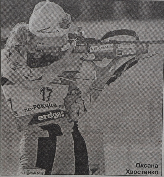 В неділю у словенській Поклюці відбулася завершальна гонка шостого етапу Кубка світу з біатлону у жінок. Дівчата йшли на дистанцію з масового старту, бігли 12,5 км і чотири рази заходили на вогняний рубіж. Перед початком гонки фахівці виділяли двох явних фавориток— німкеню Каті Вільгельм і шведку Анну-Карін Олофссон, які лідирували у загальному заліку Кубка після п ’яти етапів. Але перемогли не вони, і навіть не їхні найближчі переслідувачі, а біатлоністка з третього десятка — укра їнка з Чернігова Оксана Хвостенко.