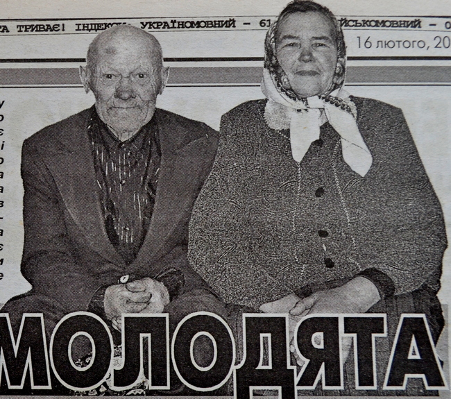 — Ми зустрічалися рік, а потім побрались,— розповідає ланка — Бачились вечорами, бо вдень було дуже багато роботи. Дадуть півгектара або гектар буряків, картоплі чи льону, і це все треба було обробити, а потім нараховували трудодні. Якщо ж ти не встигнеш і не виконаєш плану, то це вважалось ледарством і твою поведінку розглядали услл колгоспом. Тож працювали всі. А неділями незаміжні дівчата вбирались у свої найкращі вишиванки, вінки і йшли на танці до клубу. А коли дівчина виходила заміж, їй запинали хустку і вона вже сиділа вдома та порала господарство... Так було і зі мною. Коли сватали, піч колупала... На весіллі на вінику стояла (раніше казали, що він відганяє yd погані думки від молодят — відмітає їх). Справляли весілля у моїй хаті, бо людей було сила-силенна, усе село гуляло, навіть не всі за стіл вмістилися, довелось садовити у декілька заходів. Та й на золотому весіллі гостей було не набагато менше... Тепер я вже точно знаю, що не помилилася у своєму виборі, мій Іван будь-кого за пояс заткне, він у мене добрий, роботящий. Ми й зараз тримаємо дві корови, коня, п’ятеро свиней і ціле подвір’я різної птиці, щоправда, моєму дідові вже 75 і він не може стільки працювати, як раніше... Та й я його жалію, хай краще полежить, тоді він довше проживе, бо ж я не уявляю свого життя без нього.