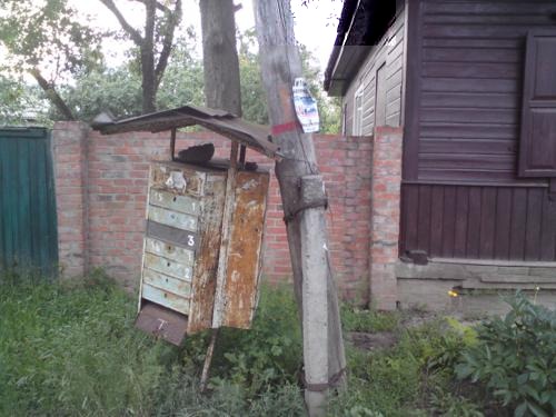 О покосившихся столбах: на улице Вихнина старый столб и почтовый ящик подпирают друг друга. Местные жители с опаской поглядывают на это противостояние гнилого дерева и ржавого железа и делают ставки, кто из доморощенных титанов одержит победу.