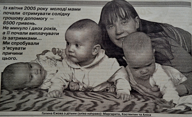 Не могла я не розпитати про виплати ще одну маму. Чернігівка Галина Єжова восени народила трійню, що стало справжньою подією у місті. «Гарт» писав про це у № 40 від 3 жовтня. Зрозуміло, що для Галини питання дер-ждопомоги дуже важливе.