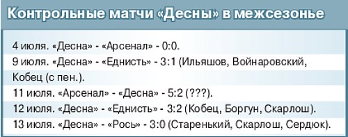 А с 11 по 13 июля черниговцы успели сыграть с киевским «Арсеналом» (поражение со счетом 2:5), еще раз с «Еднистю» (победа 3:2) и «Росью» из Белой Церкви (победа 3:0).