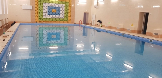 Общая площадь здания где расположен бассейн – 9838 метров. Здесь провели реконструкцию крыши, фасадов, системы отопления и вспомогательный помещений(фое, раздевалки для мальчиков и девочек, душевые, медпункт, кабинет для массажа).