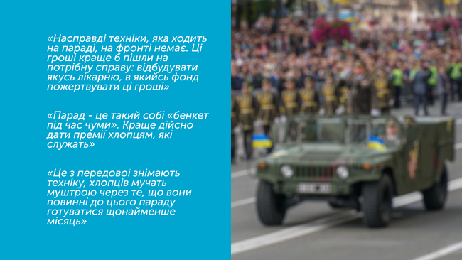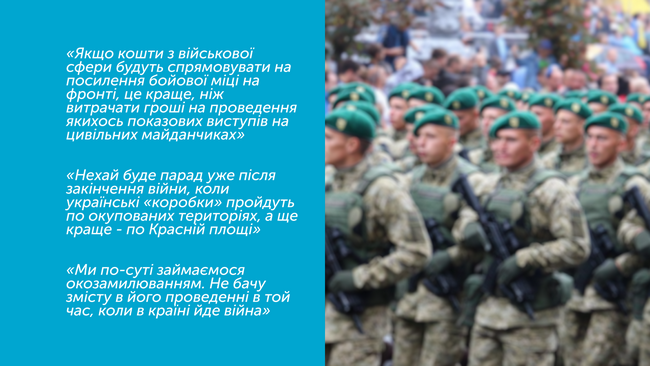 – Я проти параду. Вважаю, це порожньою витратою грошей з державного бюджету. Ефективніше ці гроші витрачати на лікування поранених на війні військовослужбовців. Краще хай люди отримають гроші, аніж робити цю показуху.