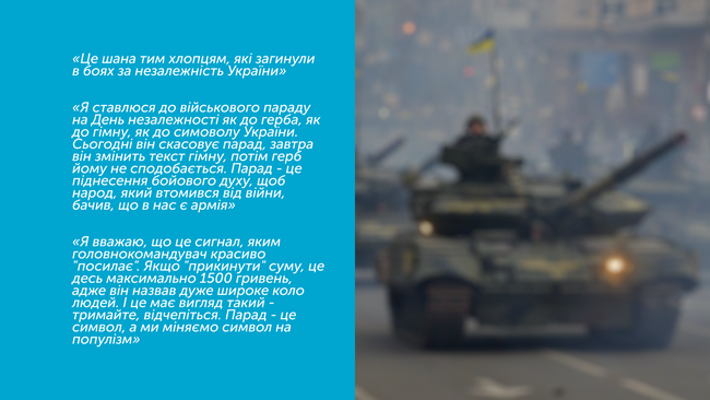 – Нині цей парад не потрібен. Аргументую це тим, що в цей парад вкладуть гроші. Усе для того, щоб просто хтось подивився. З передової знімається техніка, хлопців мучать муштрою через те, що вони повинні до цього параду готуватися, як мінімум, місяць. Я вважаю, що це гроші, викинуті в повітря. Краще, щоб ці гроші спрямувати на справу, на передову, дати хлопцям премії чи купити те, що необхідне на даний момент на передовій. Вважаю, що парад ми гулятимемо тоді, коли в нас буде перемога.