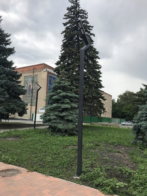 Больше двух десятков новых фонарей с оригинальным дизайном на днях было установлено возле Черниговского дворца культуры. Осветительные элементы вмонтированы в сам фонарный столб, который на верхушке формирует угол примерно в 80 градусов. В каждом фонаре есть три осветительных элемента - по два на внутренней стороне и один на внешней. Выглядит все это весьма современно.