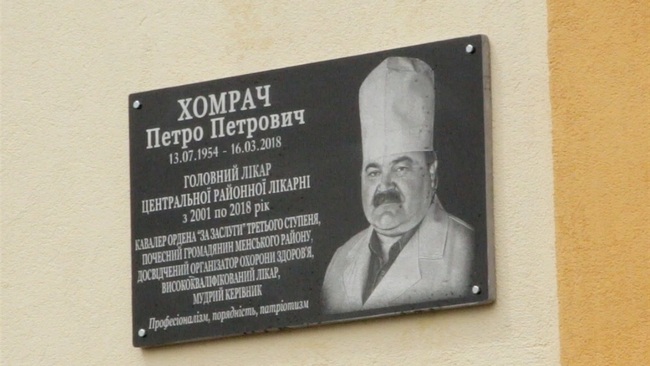 Рідні Петра Хомрача, який помер минулого року, начальник управління охорони здоров'я Чернігівської облдержадміністрації Петро Гармаш, колишні та нинішні керівники району, керівники медичних закладів області та сусідніх районів, представники громадськості прийшли до Менської райлікарні, щоб вшанувати його пам’ять.