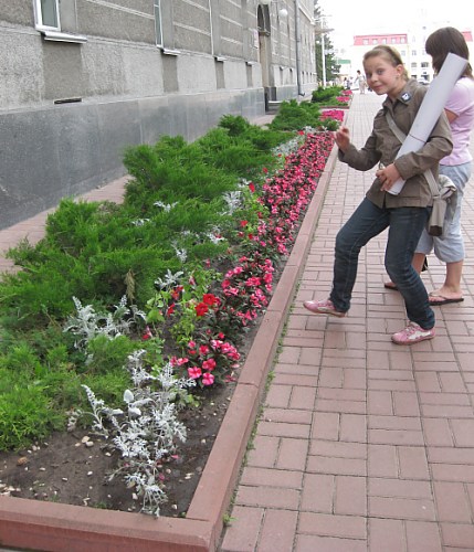 А вот оазисы на асфальте возле магазина «Прогресс» удивляют своей безыскусностью. Здесь растут только пышные кустики, которые вскоре покроются синими колокольчиками. А ведь это центральная улица города! Да если с предпринимателей, которые арендуют площади в этом магазине, собрать по 5-10 гривен, то такую красоту можно было бы создать! Или можно предложить фирмам, которые торгуют посадочным материалом, разбить здесь шикарные клумбы, пусть установят рядом небольшой рекламный щит со своими координатами - и все были бы довольны!