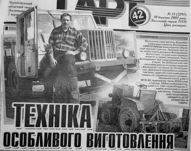 Вісім років тому житель Заудайки Ічнянського району Володимир Смоліговець власноручно зібрав свій перший трактор. Причому про це не знала навіть дружина Володимира Валентина: чоловік конструював агрегат у гаражі товариша. Тоді у Володимира був лише зварювальний апарат. На ЗІЛівські шасі він поставив двигун із навантажувача „Балканкар” потужністю 78 кінськи І сил. Довелося переробити паливну систему, адже болгарський двигун чомусь не сприймав нашої солярки.