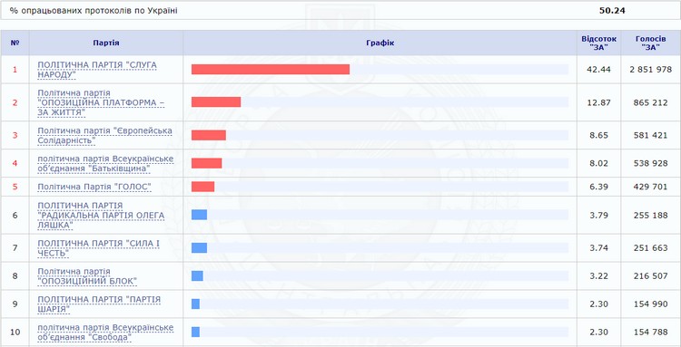 По состоянию на 11:00, ЦИК обработала 50,24% голосов. Лидеры все те же. В Верховную Раду проходят такие партии - "Слуга народа" (42,44% голосов избирателей), "Оппозиционная платформа - За жизнь" (ОПЗЖ) - 12,87%, "Европейская солидарность" - 8,65%, "Батькивщина" - 8,02%, "Голос" - 6,39%.