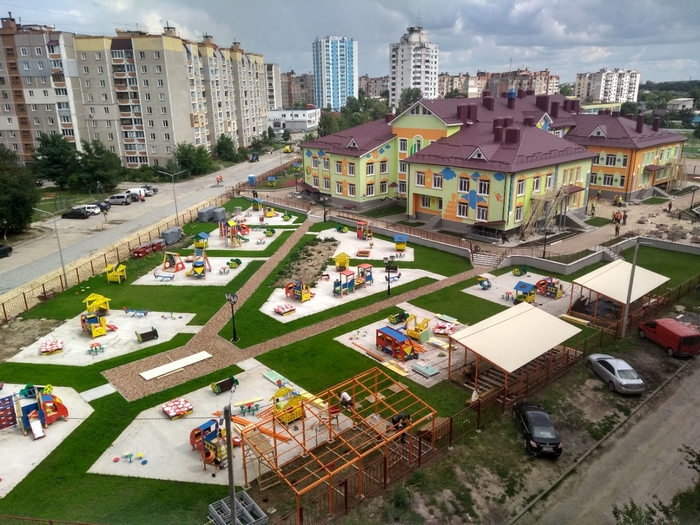 На данном этапе строительства рабочие приступили к установке навесов на детских площадках, под крышей которых дети могут играть во время дождя или, в жаркую погоду, прятаться от палящего солнца. На данный момент уже оборудовано два таких навеса и идет работа над установкой третьего.
